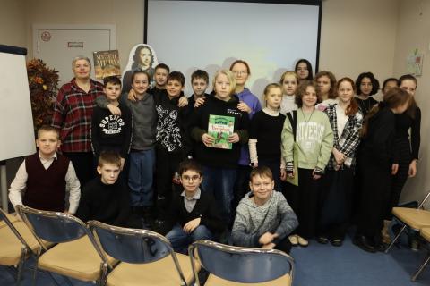 Библиотекарь также поздравила одного из учеников класса Игоря Максимова с участием в проекте ЧИСТО ПИТЕРСКАЯ ХОХМА по созданию путеХодителя НЕ ЛЕЗЬ В ПОДВАЛ! С Вадимом Агаповым со своим рисунком.